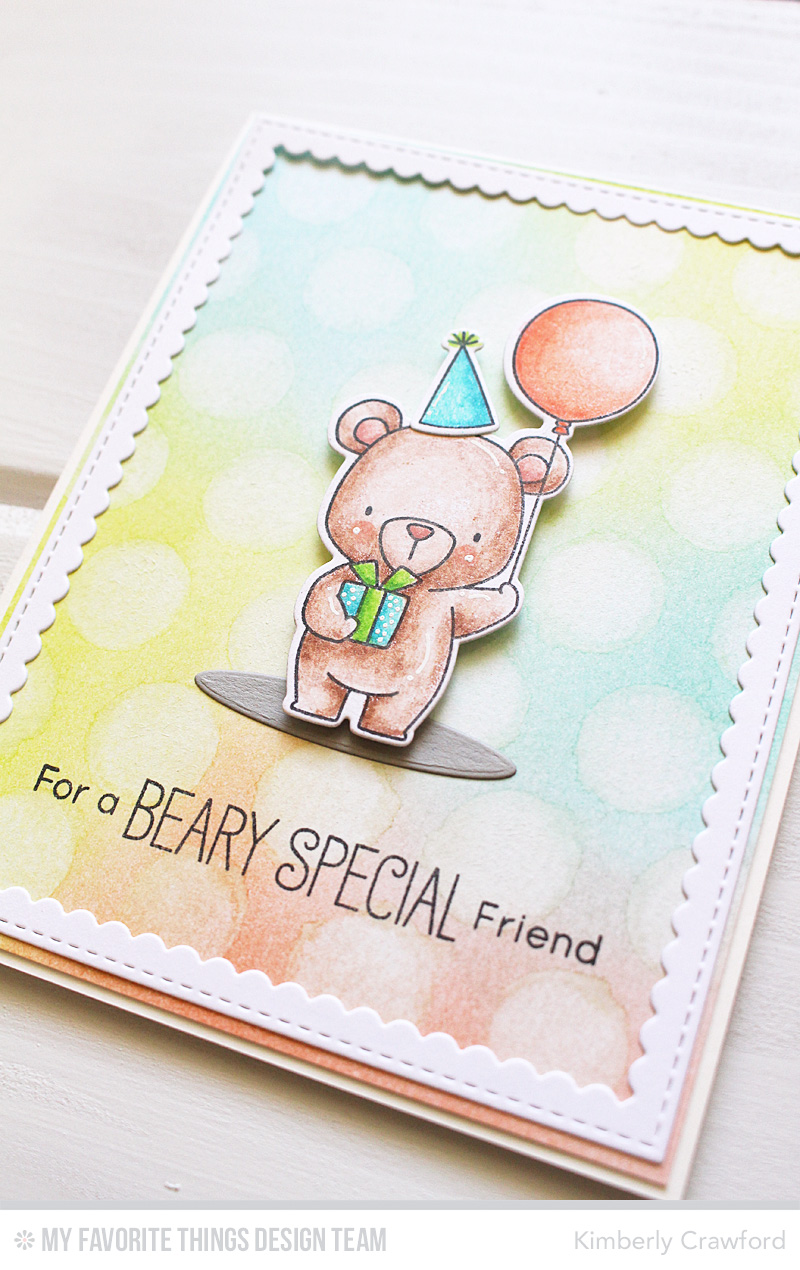 To give the bear a little more pop, I used foam adhesive, but before putting him down, he also needed to be grounded onto the card. The sentiment from Beary Special Birthday helped, but the small shadow image from the new Die-namics Oval Shadows created the best landing space!